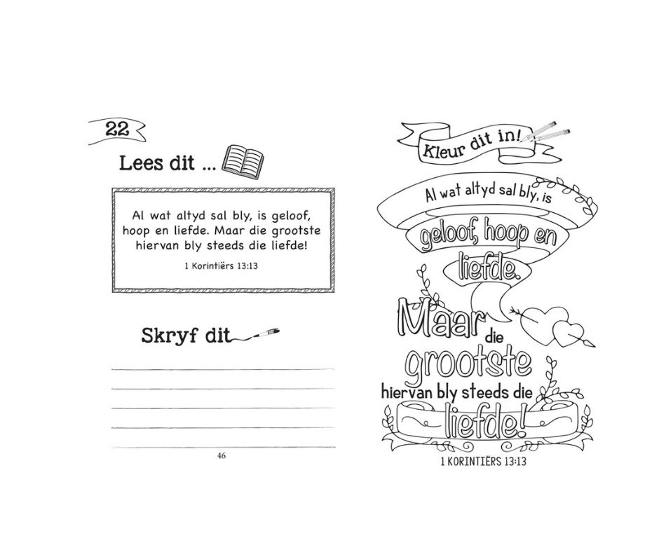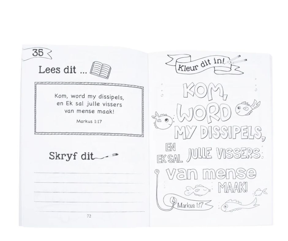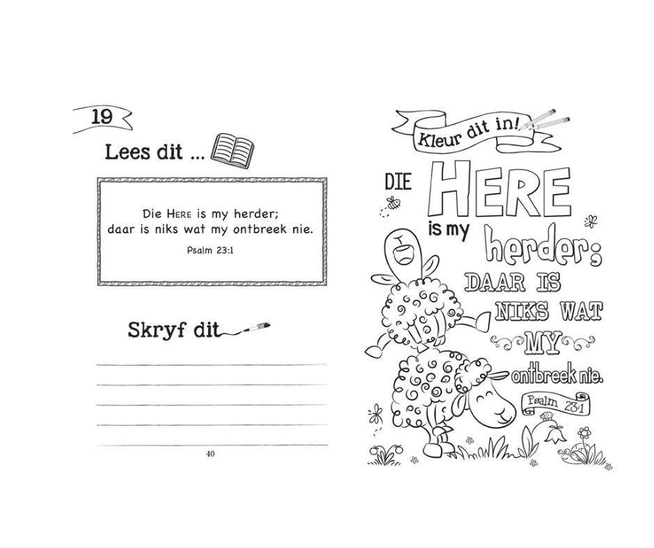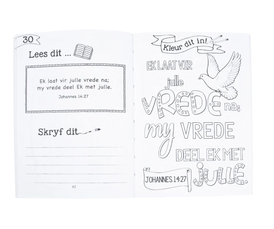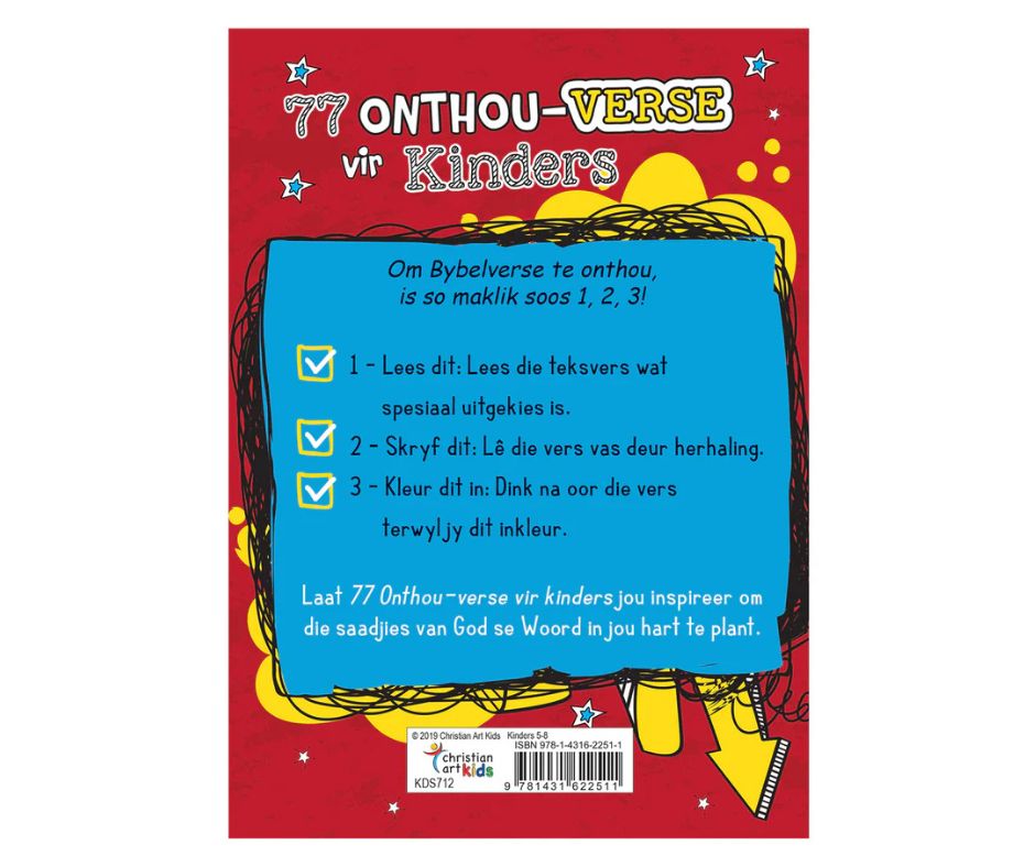Kinders tussen 5 en 8 jaar sal dit geniet om op hierdie prettige manier 77 sleutelteksverse in die Bybel te memoriseer. Hulle lees eers die teksvers, dan skryf hulle dit neer en dan kleur hulle die pragtig ontwerpte teksvers in. Herhaling is die sleutel tot memorisering en hierdie maklik-om-te-gebruik hulpmiddel sal ouers en Sondagskoolonderwysers help om die saad van die Skrif in kinderharte te saai. Ideaal vir Sondagskool of Christelik-gebaseerde tuisonderrig.