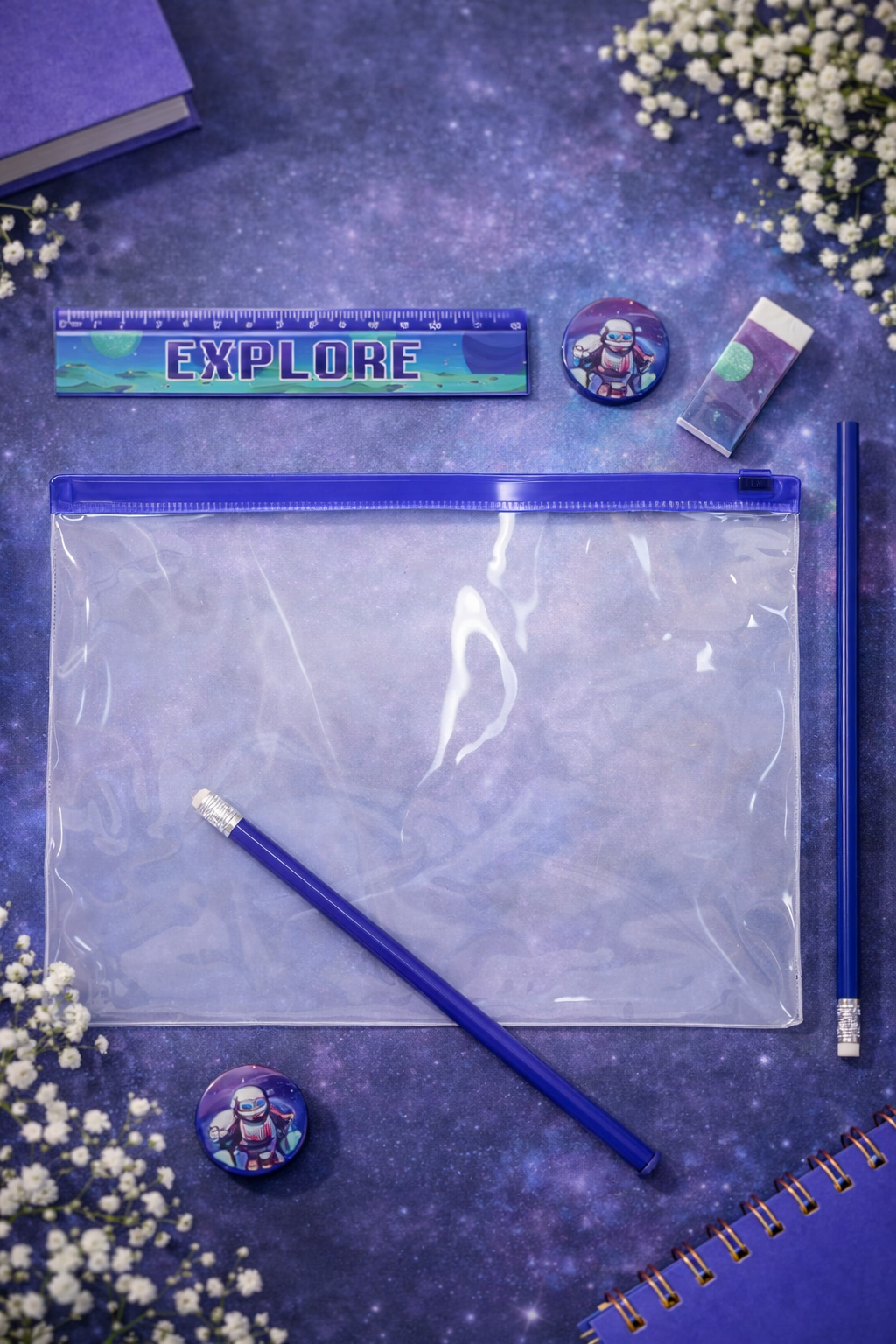 Maak gereed vir nuwe leer-avonture met die Explore Blue Skryfbehoeftestel! Met ’n koel, pixel-robot-in-die-ruimte ontwerp is hierdie stel perfek vir kinders wat hou van futuristiese pret én georganiseerd bly.